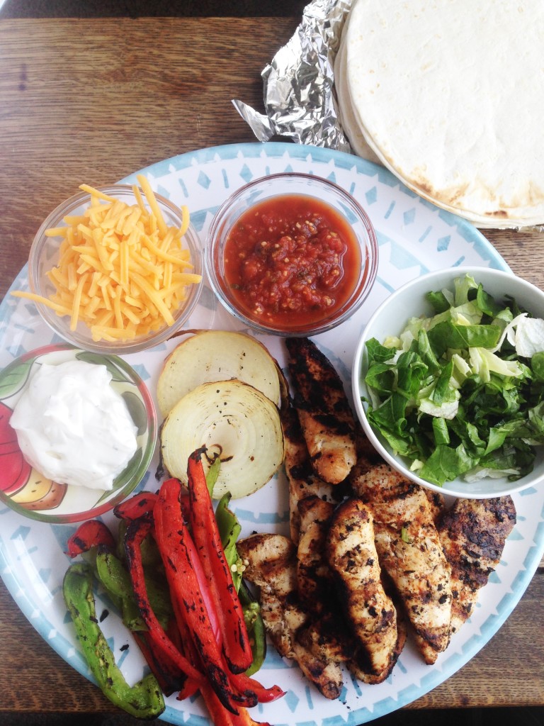 I place lettuce, our favorite salsa, some low-fat sour cream, some crispy lettuce and some cheddar cheese on a big platter. And when the meat and veggies are completely grilled, I throw those on that same platter, too. Having everything on one big dish just feel comfortable, simple, and well…. relaxed.