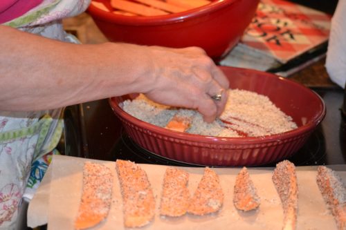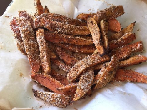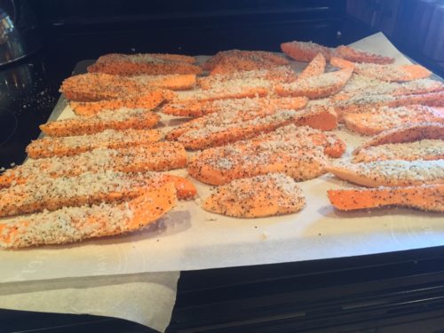 Kept seeing pics of this side dish and wondered if our crew would like these fries. (I happen to like sweet potatoes maybe a bit more than some of my family members. 😉 ) So, I bought a large sweet potato. It stared at me in the basket by my stove for a couple weeks and finally I picked it up and tried this recipe: