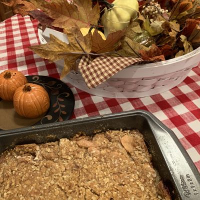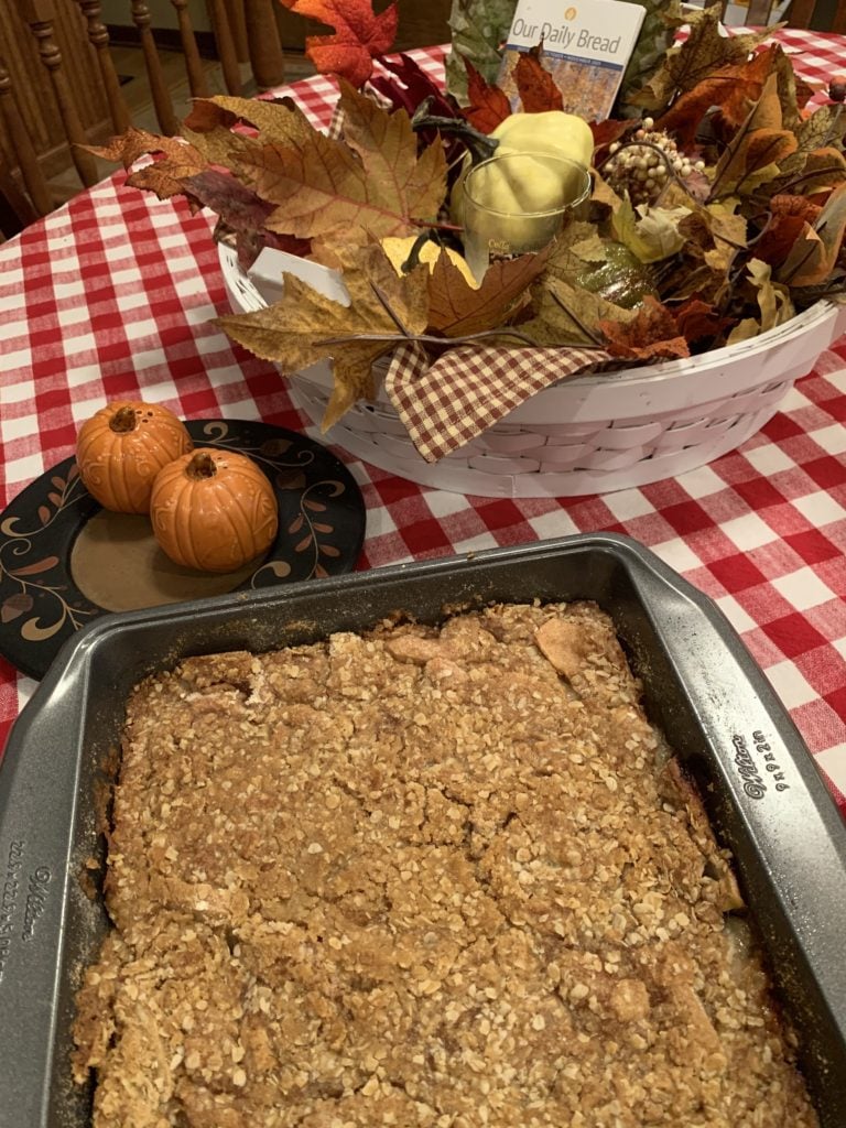 Our neighbor, Wayne, knocked on our front door one cool autumn day a few years back. As I opened the door, there he stood with a pan of fresh baked apple dessert, still hot–fresh from the oven. Wayne gathered plenty of apples from his tree in the back yard, he said, and thought he’d share them with us. Not only were we impressed with his generosity, his apple dessert was fabulous! Since that day, this is the only apple “crisp” dessert I will make. It’s fantastic, and it makes just the right amount.