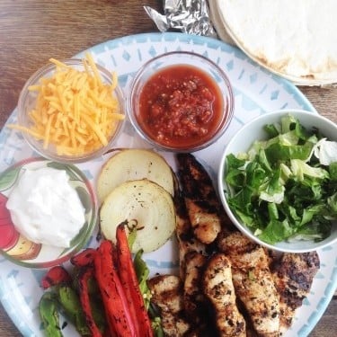 - Slice chicken and serve with the grilled veggies, warm tortillas, and toppings of your choice.