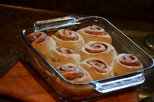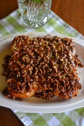 - With serrated knife, cut log into 8 equal pieces and arrange over the pecans in the pan with the swirled edge facing upward. Makes it look prettier! 🙂 Cover with plastic wrap or tea towel and let rise for about 40 min.