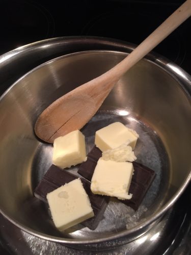 - Melt butter and chocolate in double boiler.