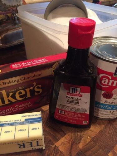 Love having a well-stocked pantry. (Doesn’t always happen around here!) So when the “chocolate bug” hits, I’m prepared. In this case, the chocolate baking bar and evaporated milk have long shelf lives. Those are 2 items that should always be in the pantry for baking and cooking. I load up on butter whenever it is on sale–sometimes sticking packages in the freezer for times such as this. 🙂 Vanilla–that mysterious liquid flavoring that comes from far away….well….just have to have it. Do have to wonder how long American cooks have had it on their pantry shelf.