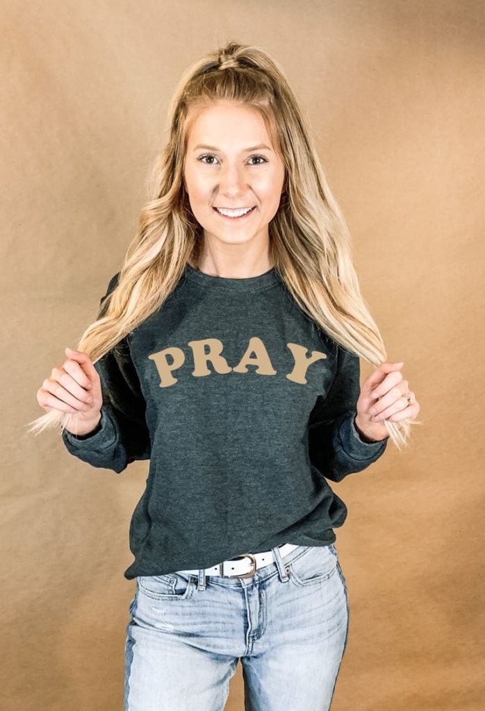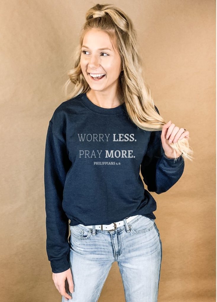 I love all of your shirts, but my favorite is “Pray More, Worry Less”
