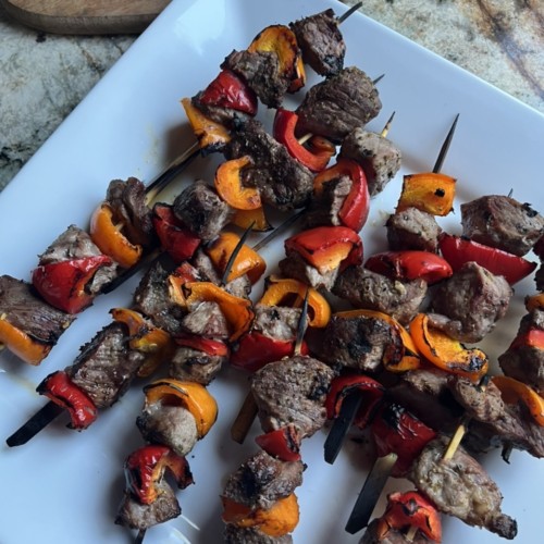 Bennett, our thirteen-year-old son, has been enrolled this year in a class called “Cooking Around the World.” A few weeks ago, he was assigned to make a Mediterranean meal. After doing some research about Greek ingredients and flavors, we came up with these Greek Beef and Pepper Kabobs.