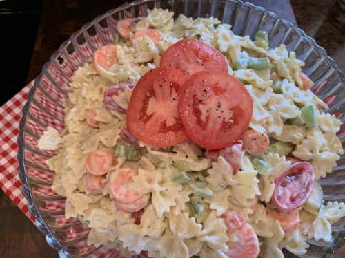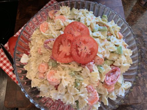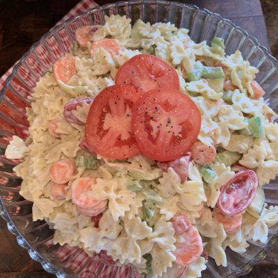 Aren’t those bow ties cute? I just love them. This a super easy and fun salad. It’s a good summer salad with all the fresh vegetables, too. I used to make this salad with 7 Seas Creamy Italian, but since it’s not made anymore, I switched it up to Green Goddess and it works well. The added Italian seasoning gives a little zing. Following are the veggies I enjoy but the nice thing about this salad is that you can pretty much use whatever you have on hand from garden or fridge. This is one of my go-to salads when I need something quick.