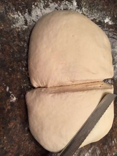 - Punch down dough, cut in half with a knife. Roll out with a rolling pin into two rectangles about 18x9 inches. Beginning with shorter end, roll up, then tuck ends under. Place in greased loaf pans. Cover. Let rise again, about an hour. Bake for approximate 30 minutes. Remove from pans and brush butter on top of loaves. Cool on wire rack. Serve any way you wish! 🙂
