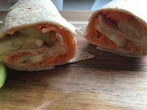 This is a super simple and quick way to achieve your daily vegetable intake! I mean 4 ingredients here. Kids have fun getting involved too – mine enjoyed shredding the carrots and folding up the wrap…and of course, eating!