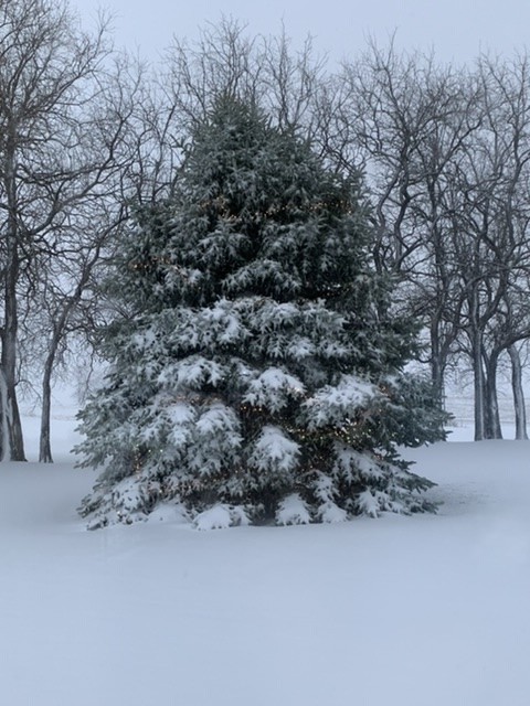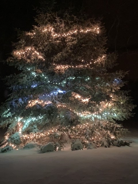 Every year we say this tree is getting too tall to decorate with lights. And every year, I see Mr. Farmer string lights around our magnificent fragrant Colorado spruce. I run out and hold the ladder for him as he winds his way around, to place the lights “just so” on each branch. A few years back a friend gave him a bamboo stick with a hook taped at one end. This old stick has been an invaluable tool for him. His work is fantastic! I give him an A+ again this year! 🙂