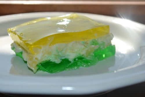 - layer one: dissolve jello in water and pour into 9x13" pan. Refrigerate until set.