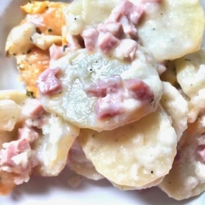 - Place 1/3 of the potatoes topped with 1/3 of ham and 1/3 of the sauce. Repeat layers ending with sauce on top.