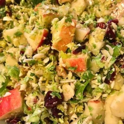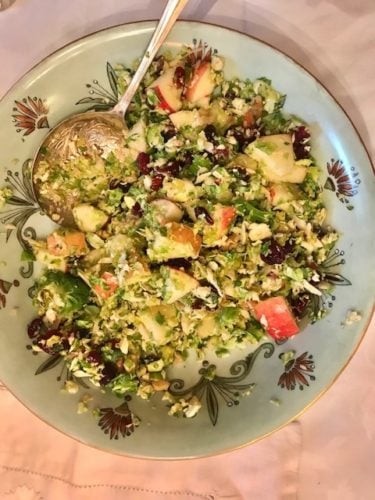 And it’s a quick one to make! This salad can be thrown together in no time. I used my food processor and “pulsed” a few times to get the shredded sprouts. I made it a day of ahead. I put the sprouts and cranberries in an air-tight container together the day before and refrigerated. Any kind of apple can be used with this, but the Honeycrisp added the extra bit of crunch and juiciness. I whipped up the dressing the day before, then all I had to do was throw it together in a mixing bowl with the sprouts and dried cranberries – then the dressing, apples, walnuts, and shaved Parmesan cheese.