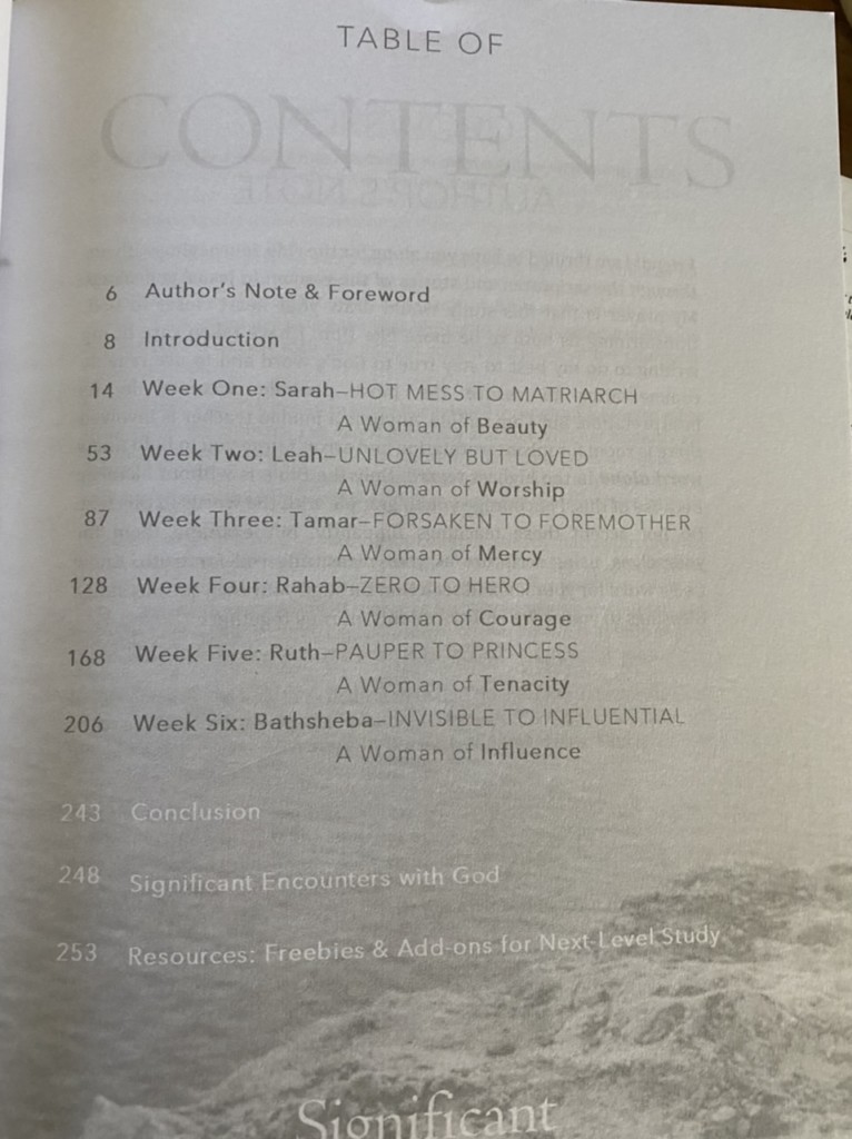 I’ve just finished week one of the study and I learned so much about Sarah, the wife of Abraham. My biggest takeaway was that God was faithful to his promises, despite Abraham and Sarah’s foibles. Even though Sarah and her husband majorly messed up (lies, polygamy, distrust), God still showed them favor and did exactly what he said he was going to do.