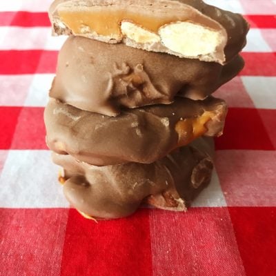Either way, a candy that is top of my list are Sticky Paws! Have you ever had them? They are a layered treat of almonds, caramel and chocolate. Williams Sonoma is one of the original makers of them. However, how quickly we tend to eat these treats we have moved into a more cost effective method…making them ourselves! I think they taste even better than the store bought ones.