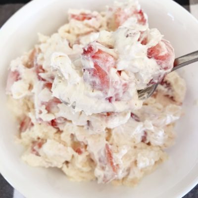 Cool and refreshing would be two adjectives for this Strawberry Cheesecake Salad. With only four ingredients, the light cheesecake flavored base with the added strawberries make this a perfect side dish or dessert for summer time. Simple to whip up and the ability to make this dish in advance also makes it great when hosting!