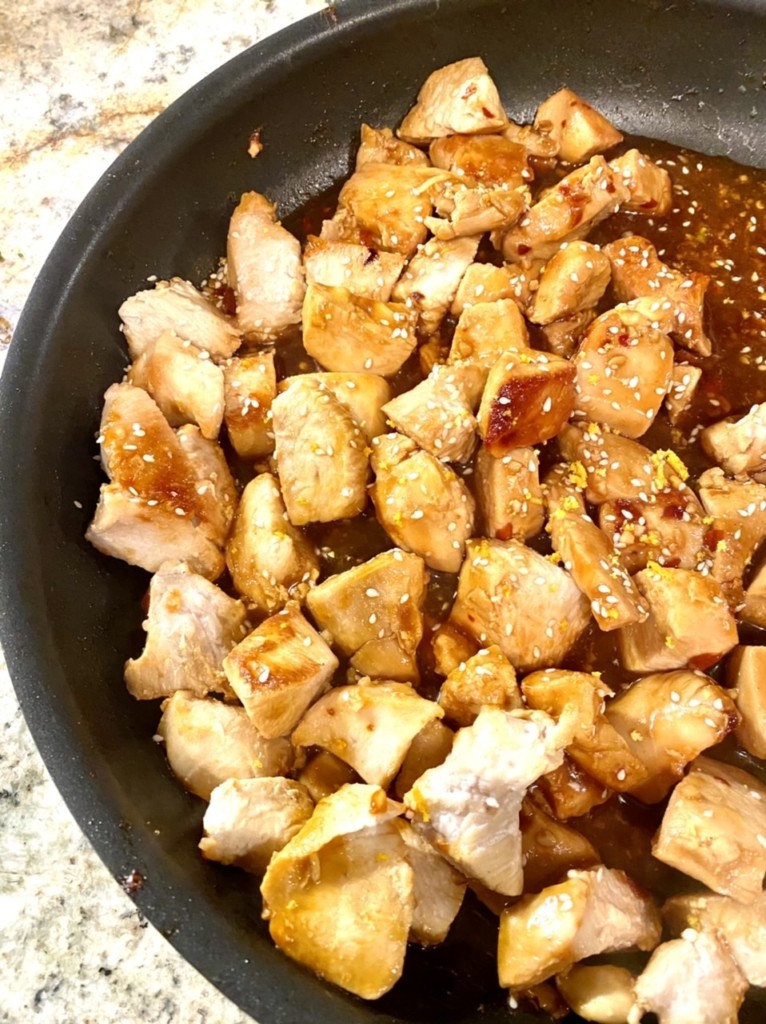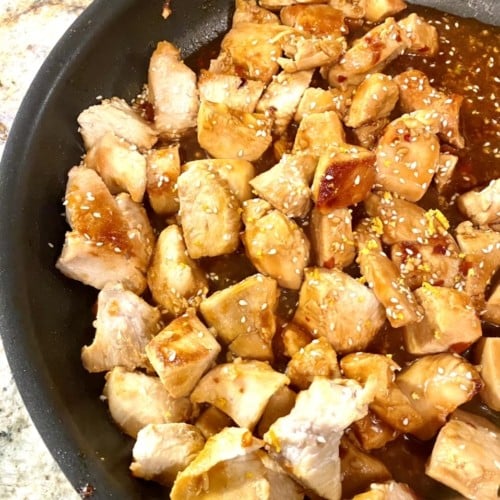 - Pour the sauce over the chicken and allow to simmer for a few minutes. Sprinkle with sesame seed, if desired.