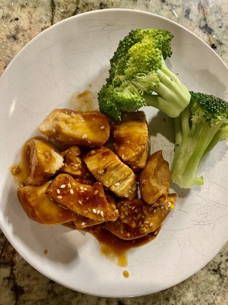 My husband and eat orange chicken with a side of steamed broccoli or on a bed of cabbage, and I serve rice with it for my growing kiddos. We absolutely love eating the guilt-free version of this sweet and slightly spicy dish.