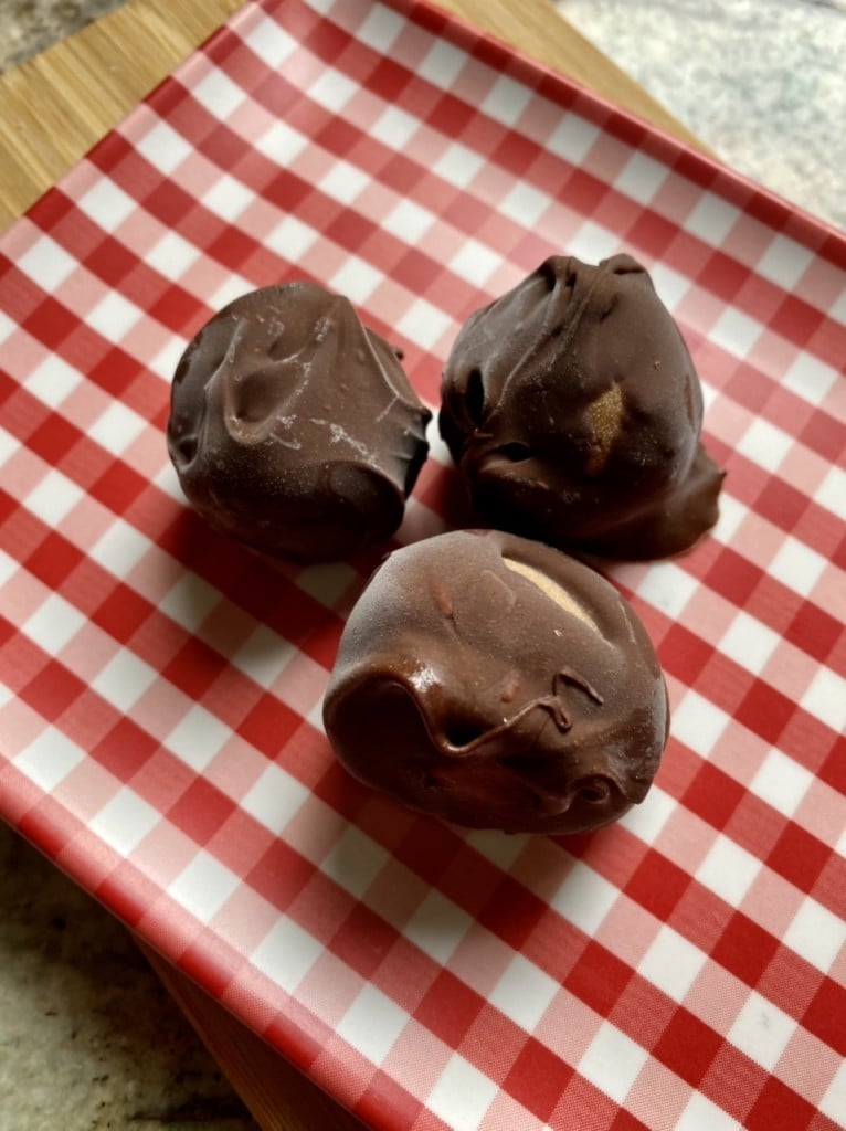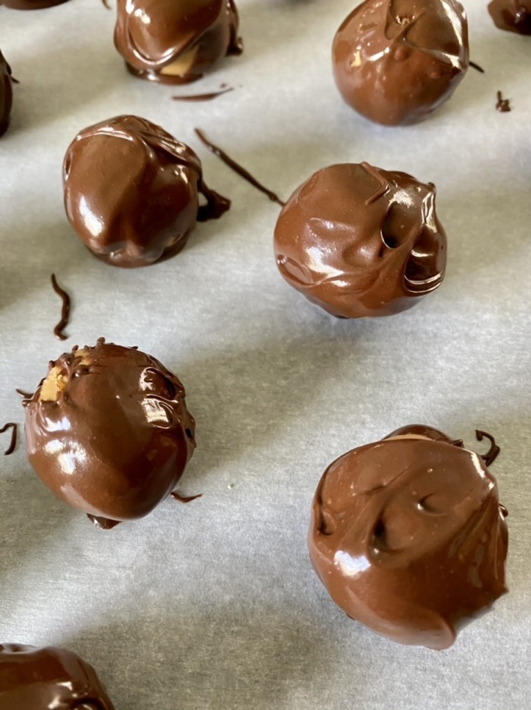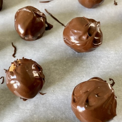 - Dip the peanut butter balls in melted chocolate mixture and place on a wax paper or parchment paper covered tray. Store in freezer until ready to eat.