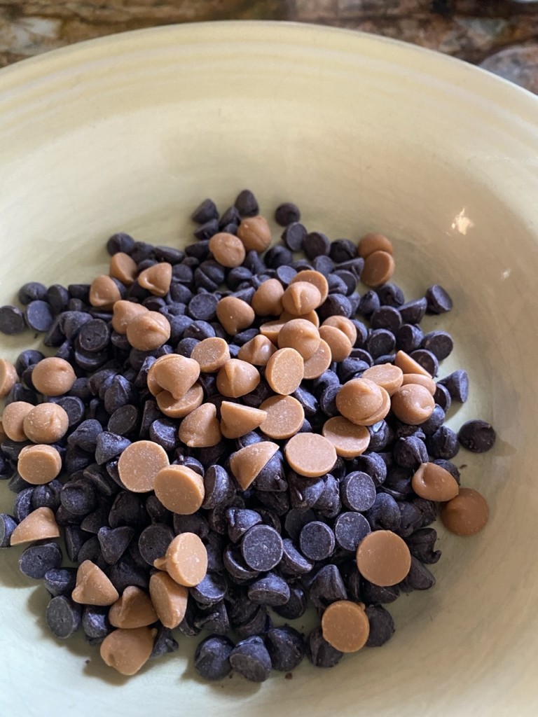 Melt the chocolate chips and butterscotch chips in the microwave in 30 second increments, stirring after each round. Be careful not to scorch the chocolate!
