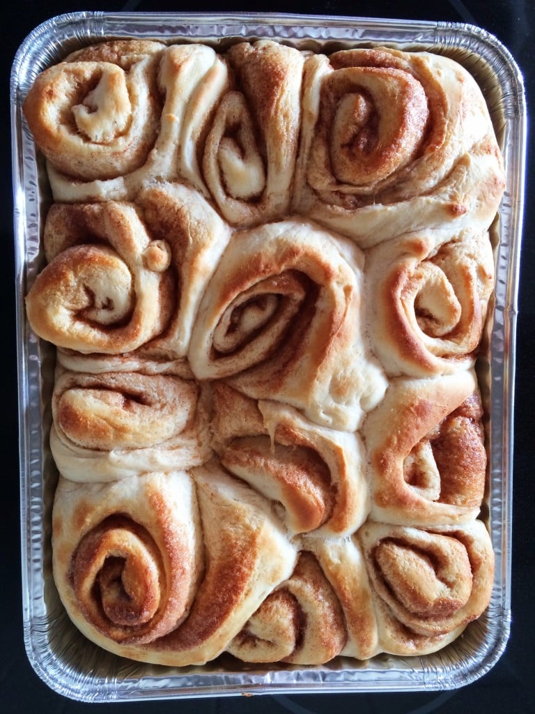 - Spread frosting onto both trays of cinnamon rolls and enjoy!