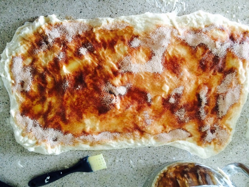 - Spread ¼ cup melted butter and sprinkle with ½ cinnamon sugar mixture
