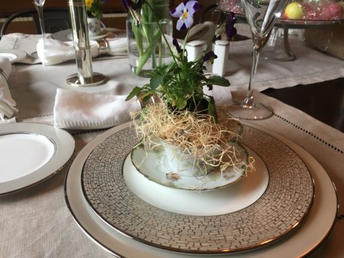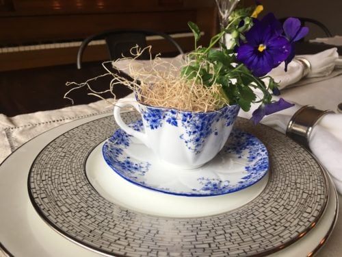 Preparing is a lot of the fun for me. I have several sets of teacups and saucers passed down to me from my Grandmother – each one is so unique. I use one at each place setting and fill them with a pansy and greenery. If you plan to use the teacups for drinking, then make sure to line the cup with foil or plastic wrap first. I also love to use fresh flowers whenever possible – they are a beautiful reminder of the season.