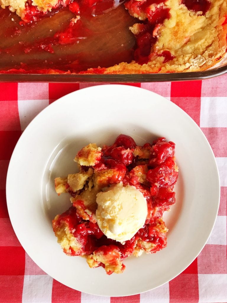The four ingredients in this dessert include: canned cherries, almond extract, boxed yellow cake mix and unsalted butter. (Adding in the almond extract to the canned cherries makes the dessert taste more like a fresh cherry dessert. It’s that simple, four ingredients, dump and bake for a warm fruit dessert.