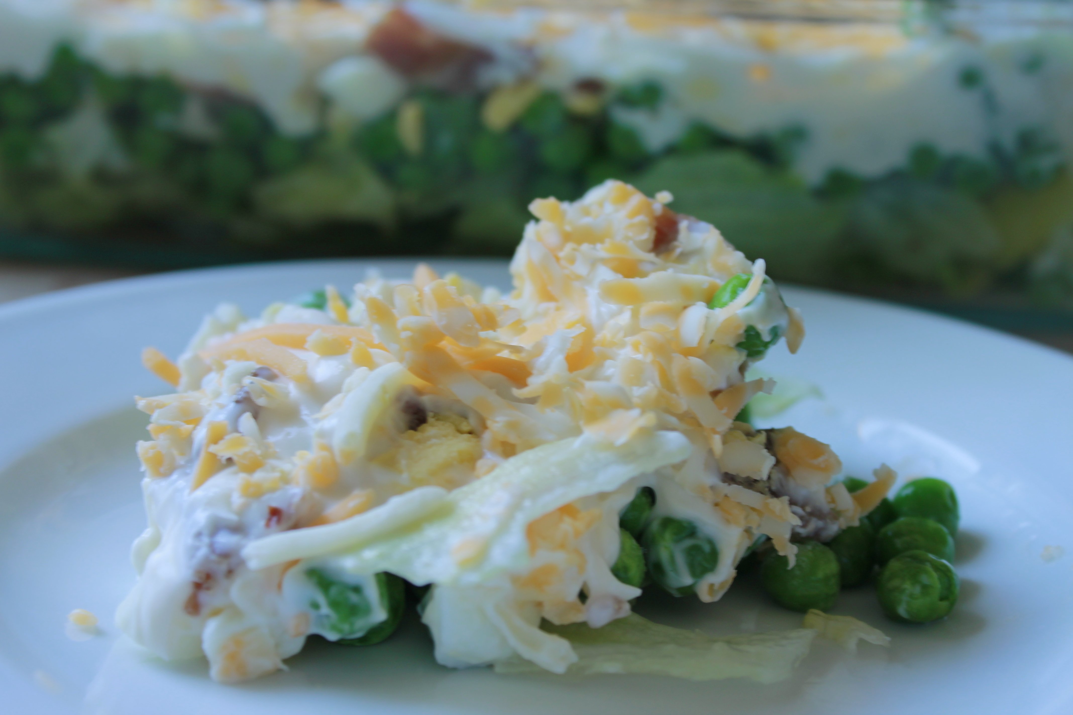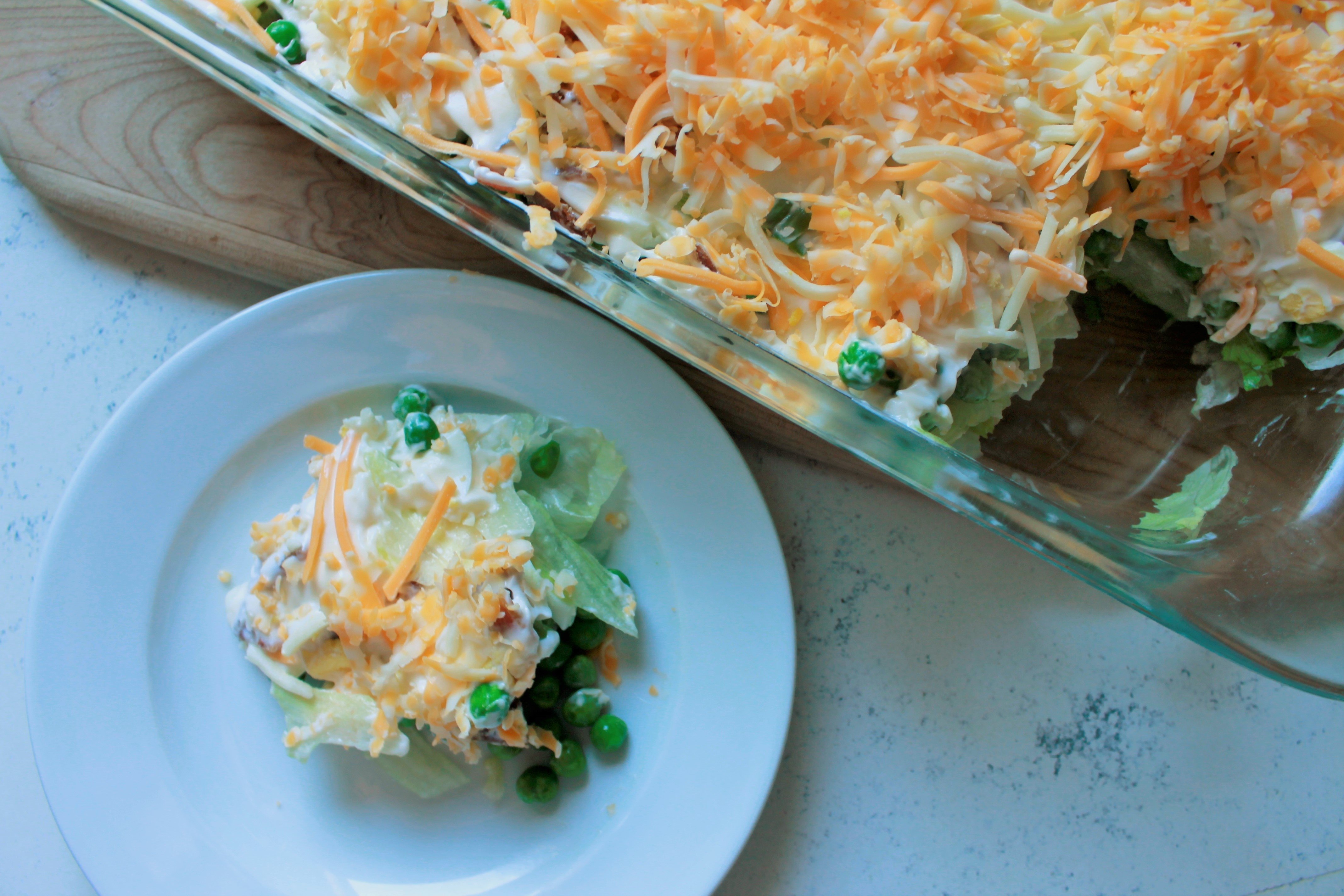 - In a 9 x 13 pan, shred lettuce to half full. Then add: peas, then onions, then eggs, then bacon. Frost with mayonnaise. Top with shredded cheddar cheese. Refrigerate. Can be made in large glass bowl and tossed before serving.