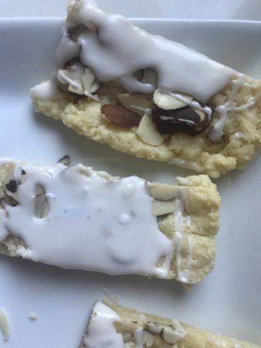 When I found this fairly simple recipe for making almond bars with glaze and sprinkled almonds my mouth was watering and I was thinking how perfect they would go with coffee. They did not disappoint. The enchanting aroma of almond left the house with a sweet lingering scent.