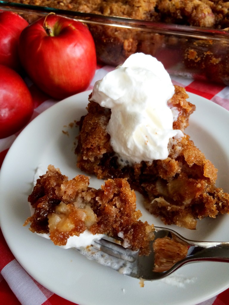 A moist apple cinnamon inside with a crispy, sugary crumble topping. Top it with some homemade whipped cream or vanilla ice cream and it is a PERFECT Fall dessert….or even breakfast if you live under our roof. Hope you enjoy this recipe as much as we do!