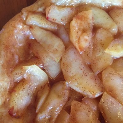 - Melt butter in regular sized skillet. Add ¼ C sugar and stir together. Slice apples into ⅛" slices and arrange in circular pattern, filling the skillet. Simmer a couple minutes.