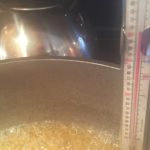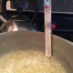 - Place sugar, syrup and hot water into a heavy bottom pan (I use a small dutch oven, Club Aluminum). Stir until dissolved. Continue stirring occasionally, boiling until it reaches 300 *, using a candy thermometer.