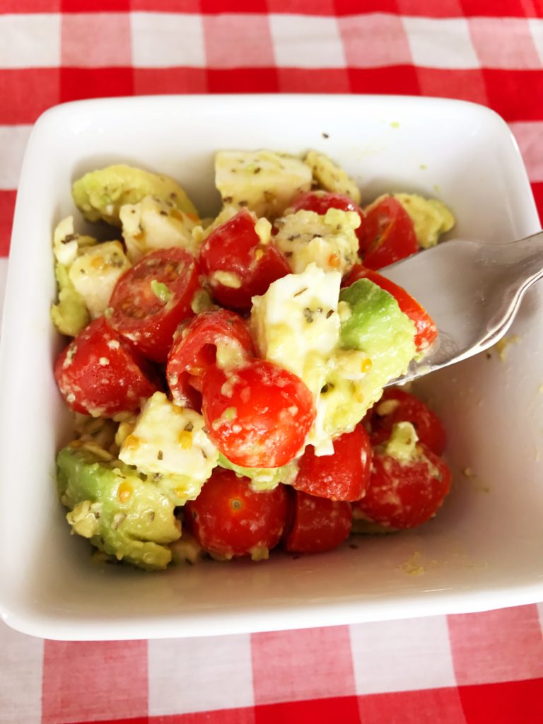 It’s nearly Spring here in Iowa and I have been craving those fresh fruits and vegetables for quite a while! I am looking forward to warmer months ahead and all the fresh from the garden goodies. Although, it’s not nearly time to enjoy the bounty of ones garden, this salad will tide me over until then! The fresh ingredients of cherry tomatoes, avocado and fresh mozzarella mixed with light olive oil and basil are a perfect blend. You can use fresh basil if you have on hand or dried works out well too!