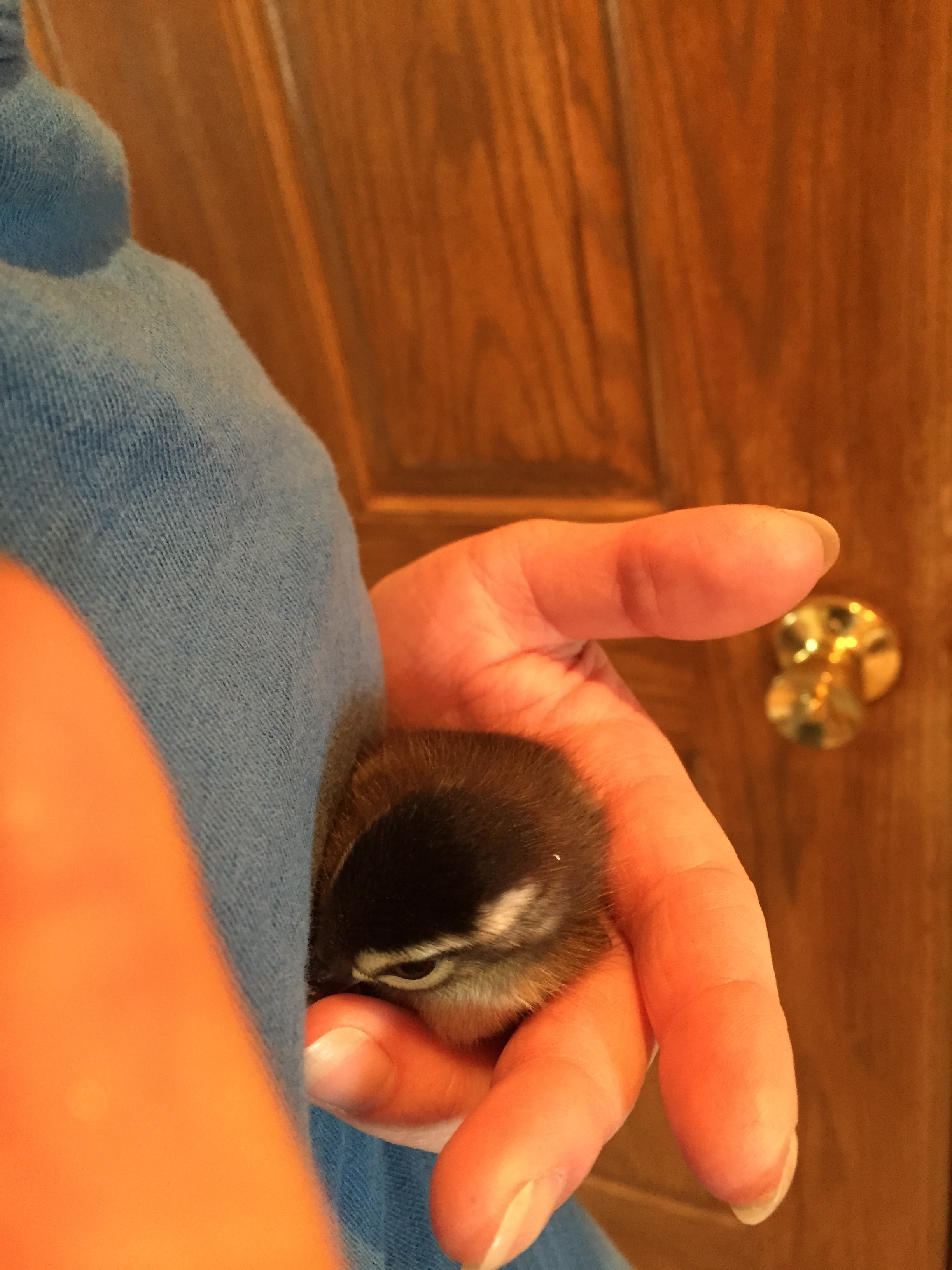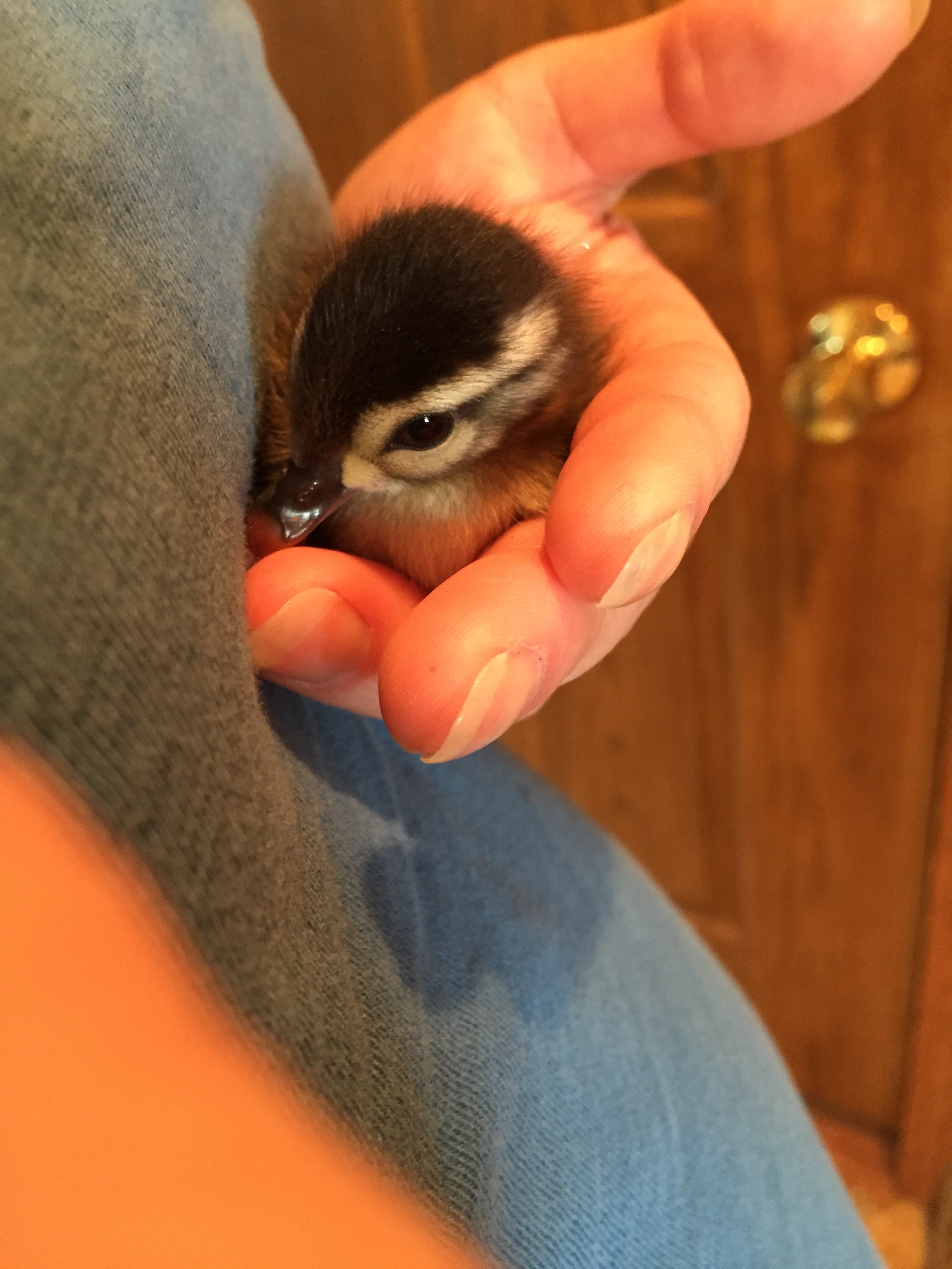 I came to their rescue a couple of times, and helped them out . They were pretty fast!! I was able to catch one! I brought it in to show Mom. This little baby felt really nice and soft in my hands. One duck I held was quite active and afraid, wanting out of my hands, but the other duckling was the the most calm little creature, seemingly trying to fall asleep.