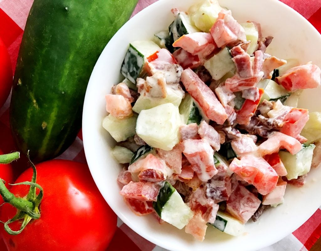 - Placed chopped tomatoes, cucumbers and bacon in a bowl and gently toss and until well mixed.