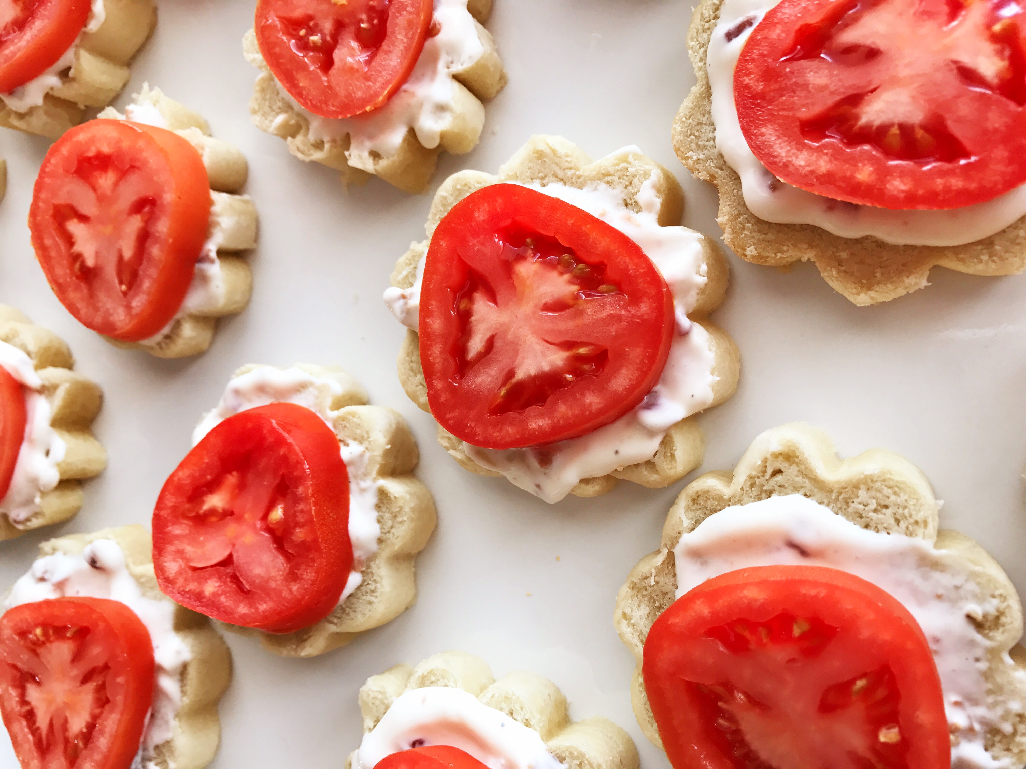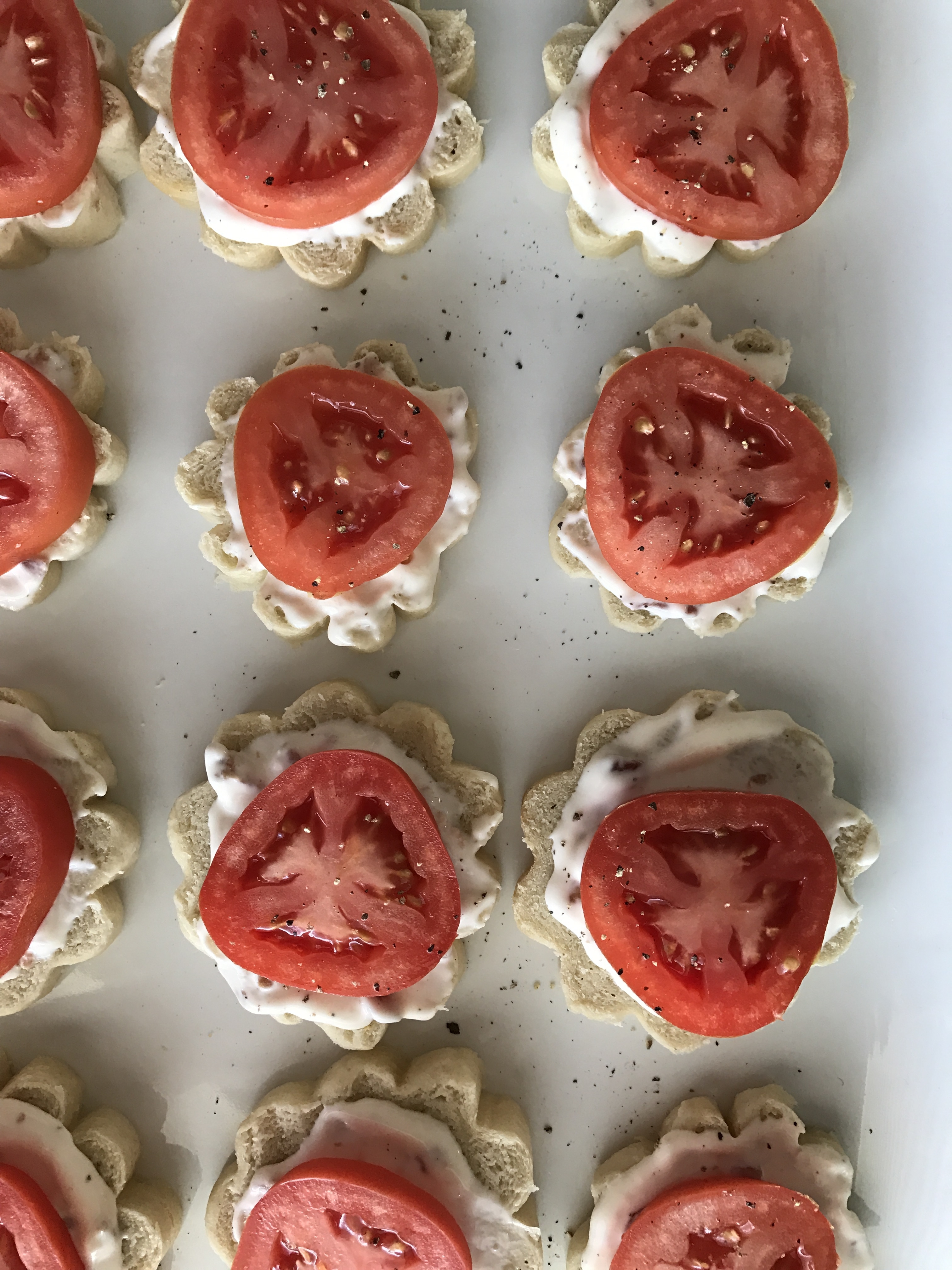 These little sandwiches work well as an appetizer or at tea time. A fun little snack at a bridal or baby shower too. They put together easily and are always a crowd favorite. The sandwich begins with some good white bread, you have a few options for this. You can choose your favorite store bought bread and cut it down to size with a cookie cutter or round glass or my favorite is to buy a frozen bread loaf (such as rhoades) and stick it into a bread tube and bake and slice. Fresh, delicious and fun shapes.