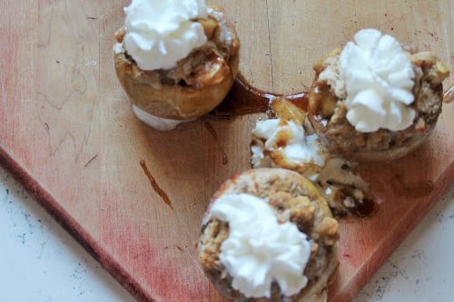 I made this twice this week. Once for a smaller serving, placed in apples (all you have to do is scoop out the inside of the apples and use them as bowls). Then bake for 10-15mins. The other occasion was for our Tailgate Party – out in the soybean field. I made (2) large 9 x13s and quadrupled the recipe. It was a decadent treat as the daylight was slowly fading… I’m guessing those farmers weren’t too disappointed about it either. 🙂