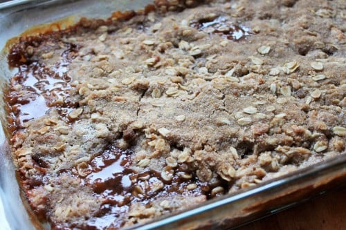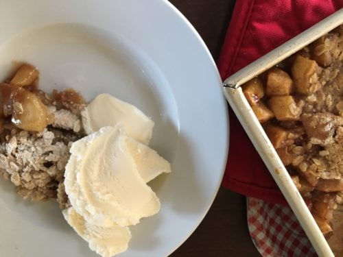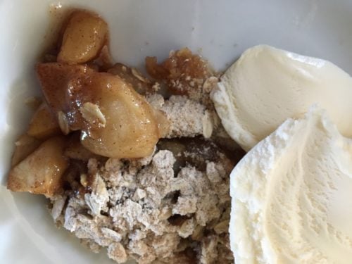 - Bake for 15 minutes until crumble topping is crispy. Serve warm and top with ice cream and caramel sauce if desired. Enjoy!