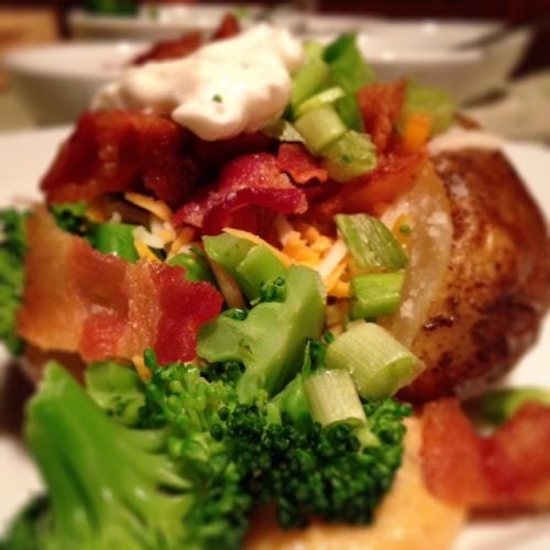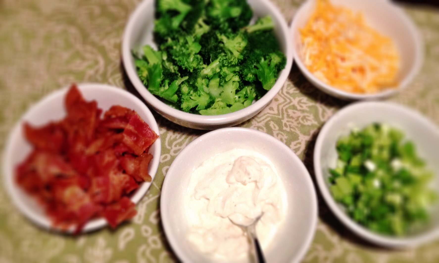 Add all of your favorite toppings and load up that potato: bacon (ham pieces would be good too), sour cream, green onion, cheese sauce, shredded cheese, broccoli – and enjoy!