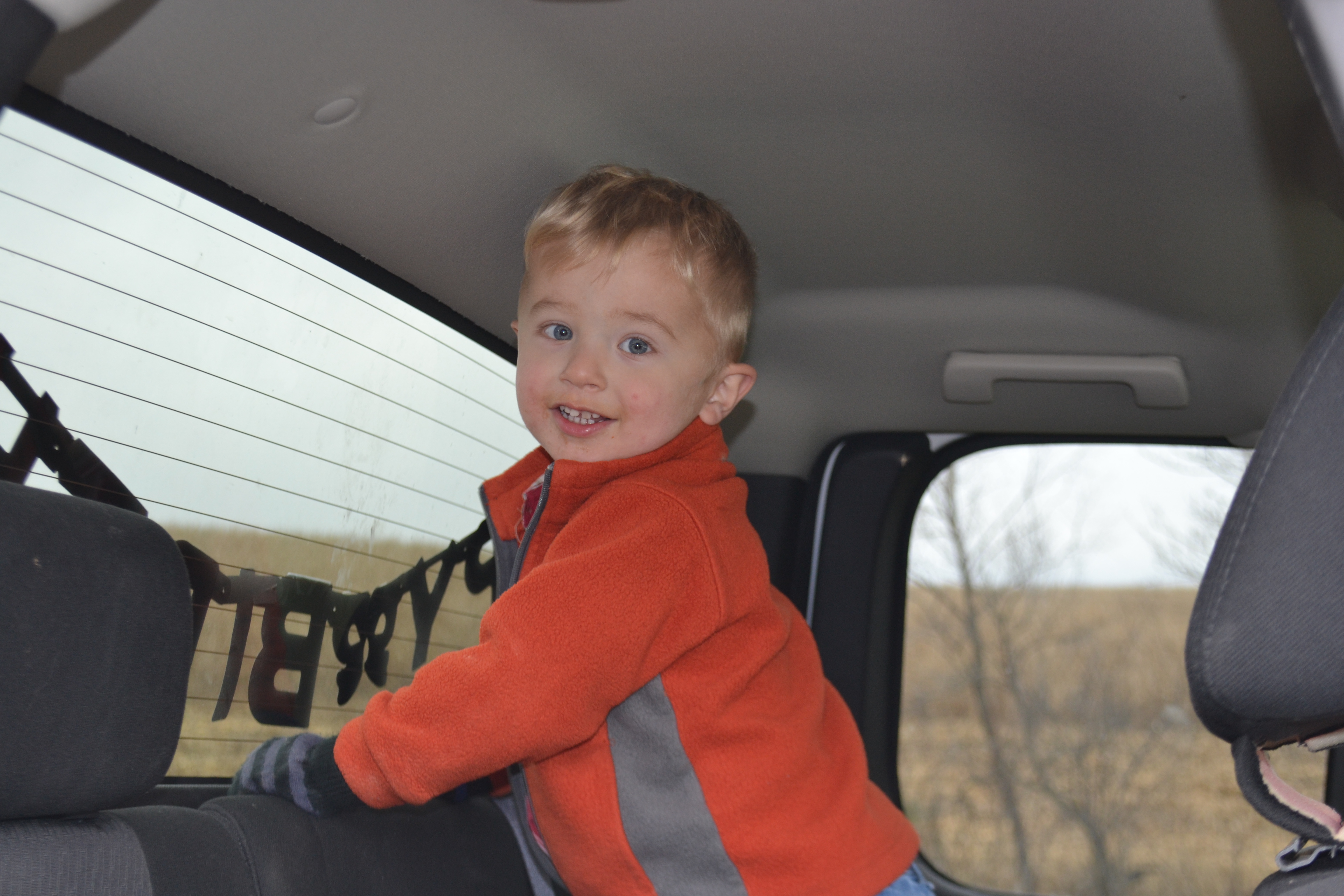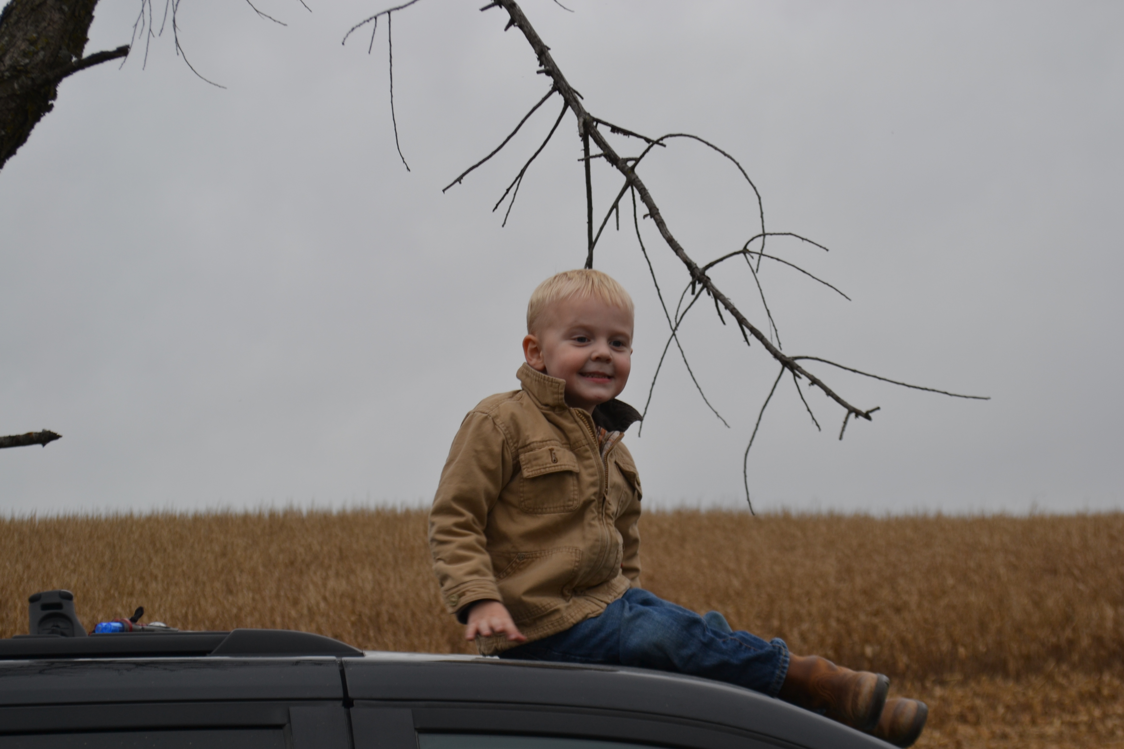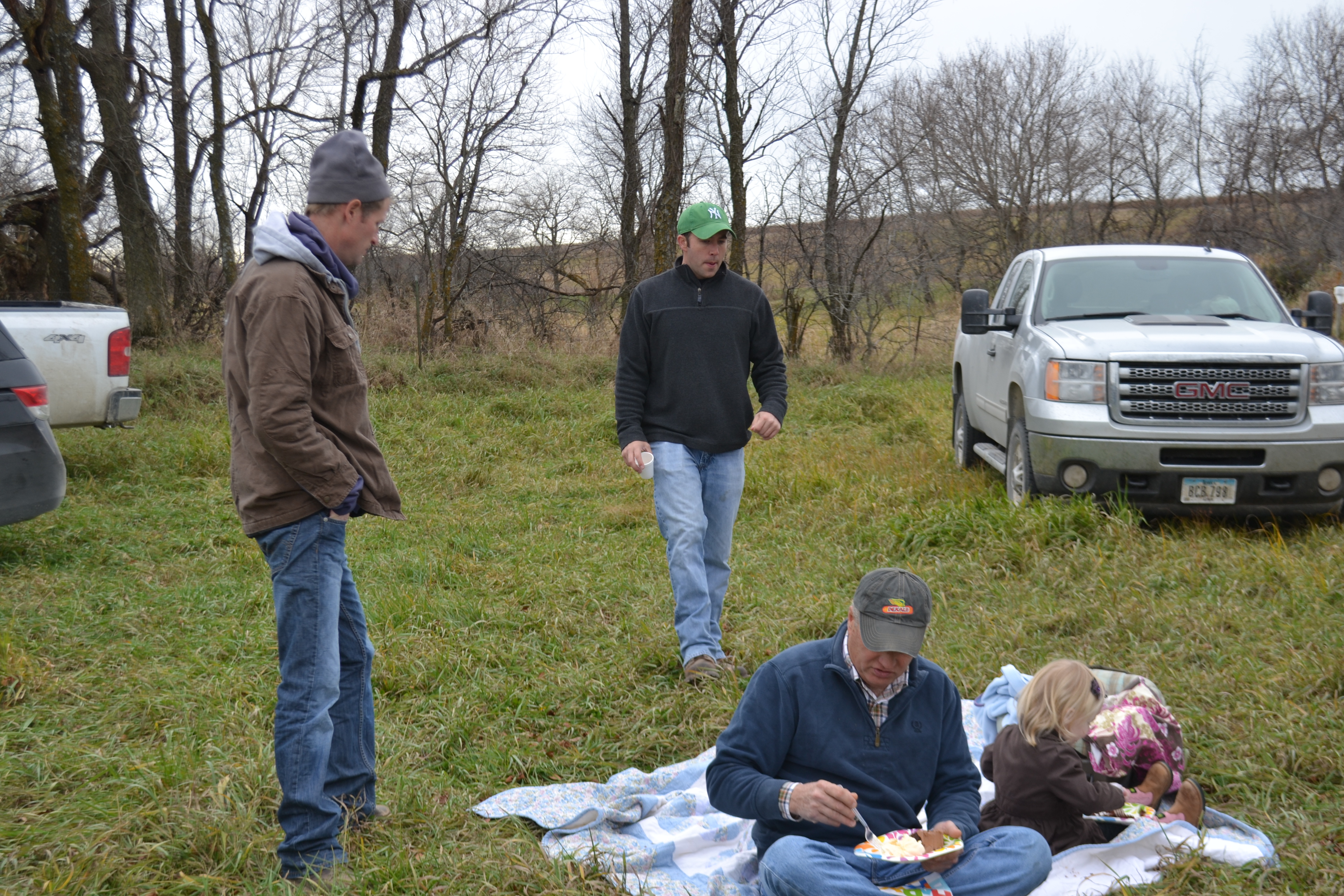 Over the hill, in the corner of the field lies a ditch with running water. It’s a private little spot, one the family has visited in the past; a little hideaway. This would be a perfect spot for our little birthday party lunch….a tailgating lunch, in honor of a wonderful little boy. I call him “Gentle Ben”, for he has such a gentle way about him. And he says, “Let’s Eat!”