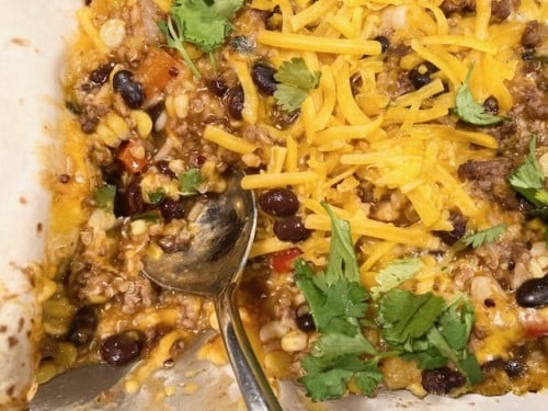 As I was looking into menu planning for the week, I was craving Mexican food- cilantro, spicy salsa, and avocado are essentials I must have with it! I found a healthy black bean and beef enchilada bake mixed with quinoa, corn, and peppers – yum! My mouth was watering. It’s packed with protein, and not very many carbs, so this is a great keto alternative. One could also use as enchilada filling or serve on top of chips (which is what I did).