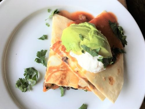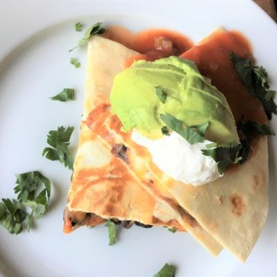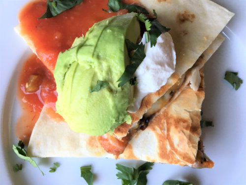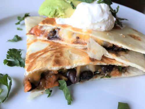 I found this simple and healthy recipe that we all enjoyed for dinner…I was low on my grocery stock, when I realized I could use just a few basic ingredients to make this healthy meal. My son loves anything with salsa and cheese (chips, too). I’ve been trying to add more fresh ingredients to our menu – especially fiber. Also, these only take 15 minutes or less to make, which makes for a quick and easy lunch or supper. With these, the filling is less obvious – I don’t think anyone realized there was actually no meat in these quesadillas – it was actually sweet potatoes and beans 🙂 If you want to add in more veggies – onions and peppers could easily be thrown in.