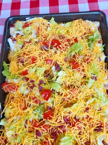 If you are a fan of the appetizer vegetable pizza, then you must give this BLT Pizza a try. It is the same concept of the crescent roll bottom crust and topped with a ranch cream cheese layer followed with bacon, tomato, lettuce and cheese. It’s super easy and super delicious!