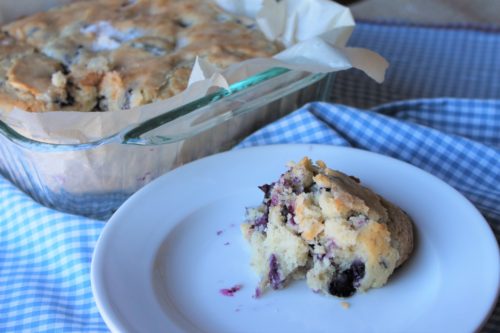 - Grease and 8- or 9-inch square baking pan with butter or coat with non-stick spray. If you have parchment paper on hand, line the pan with it over the butter. Spread the batter into the pan evenly. Sprinkle top of the batter with remaining tablespoon of sugar. Bake for 35-45 minutes. Check for doneness with a toothpick. Let cool at least 15 minutes prior to serving.
