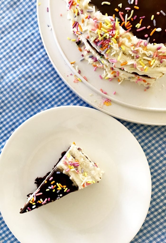 This Brownie Cake Batter Ice Cream Cake is on the top of my list for the summer. Â It looks fancy but is fairly easy to make and the layered brownie, cake batter ice cream and fudge are perfect for summer time (or anytime actually). Â Â Be sure to give this a cake at your next gathering or even a birthday party. Â You will be glad you did.