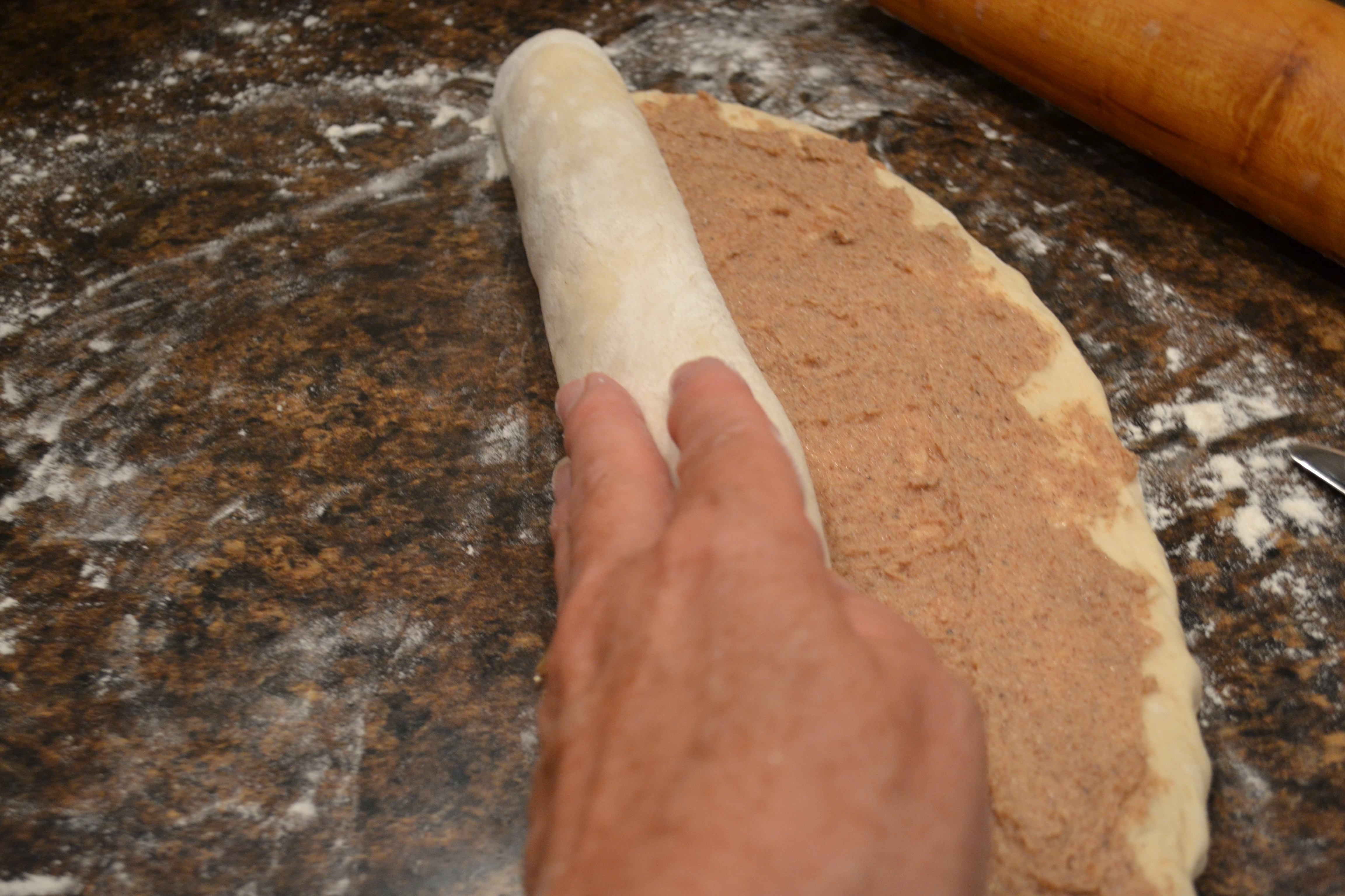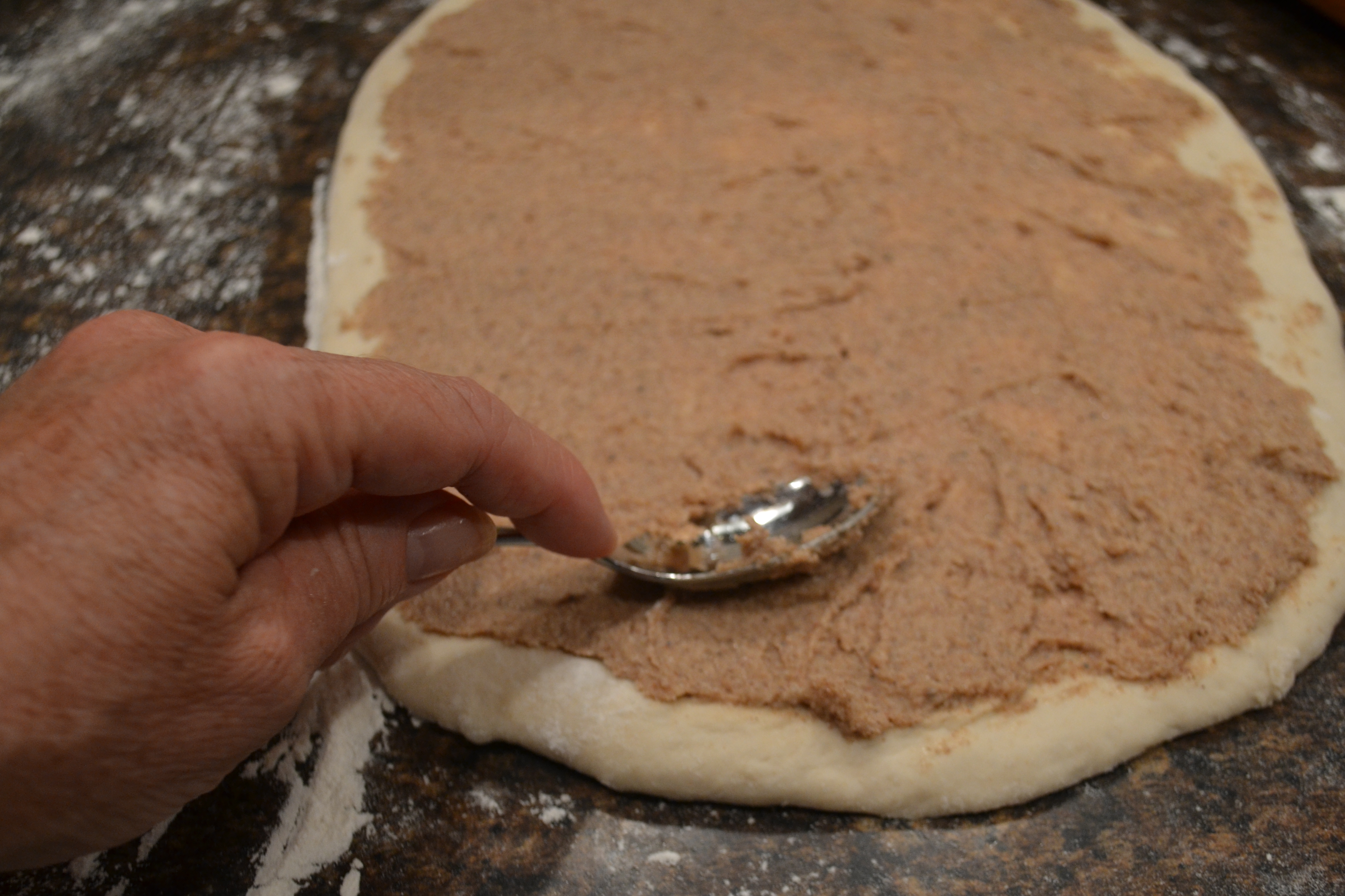 - Filling: Cream together butter, sugar and spices. Spread over dough and sprinkle top with nuts. (Optional). Starting with long side, roll up into a log.