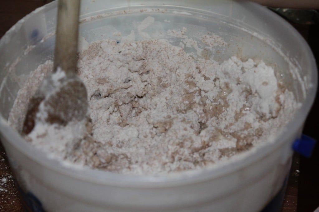 I love it! I use this recipe on a regular basis. Later, it became known to us as, Bucket Bread – thanks to Annie! She uses a gallon ice cream container with a lid for bread making and storage, and now I do too. The bucket makes the process so simple and easy. And did I mention, this recipe requires no kneading? And you can use the same bucket for mixing and for rising and for storing! Yeah!