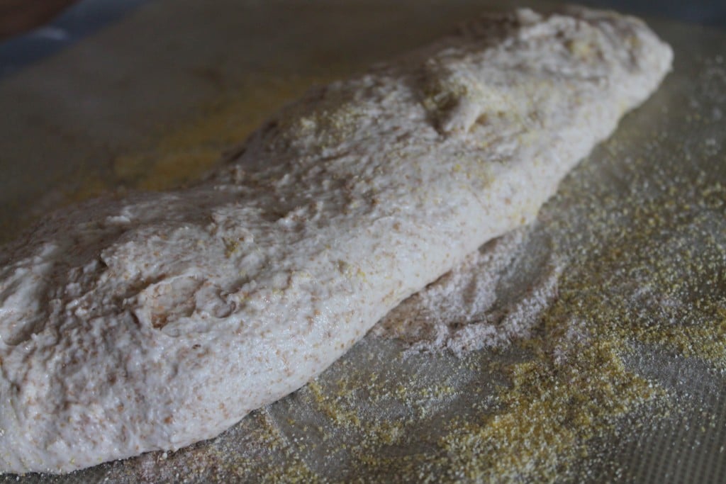 - One pound (grapefruit size portion) Boule dough for Baguette. Pizza peel: whole wheat flour