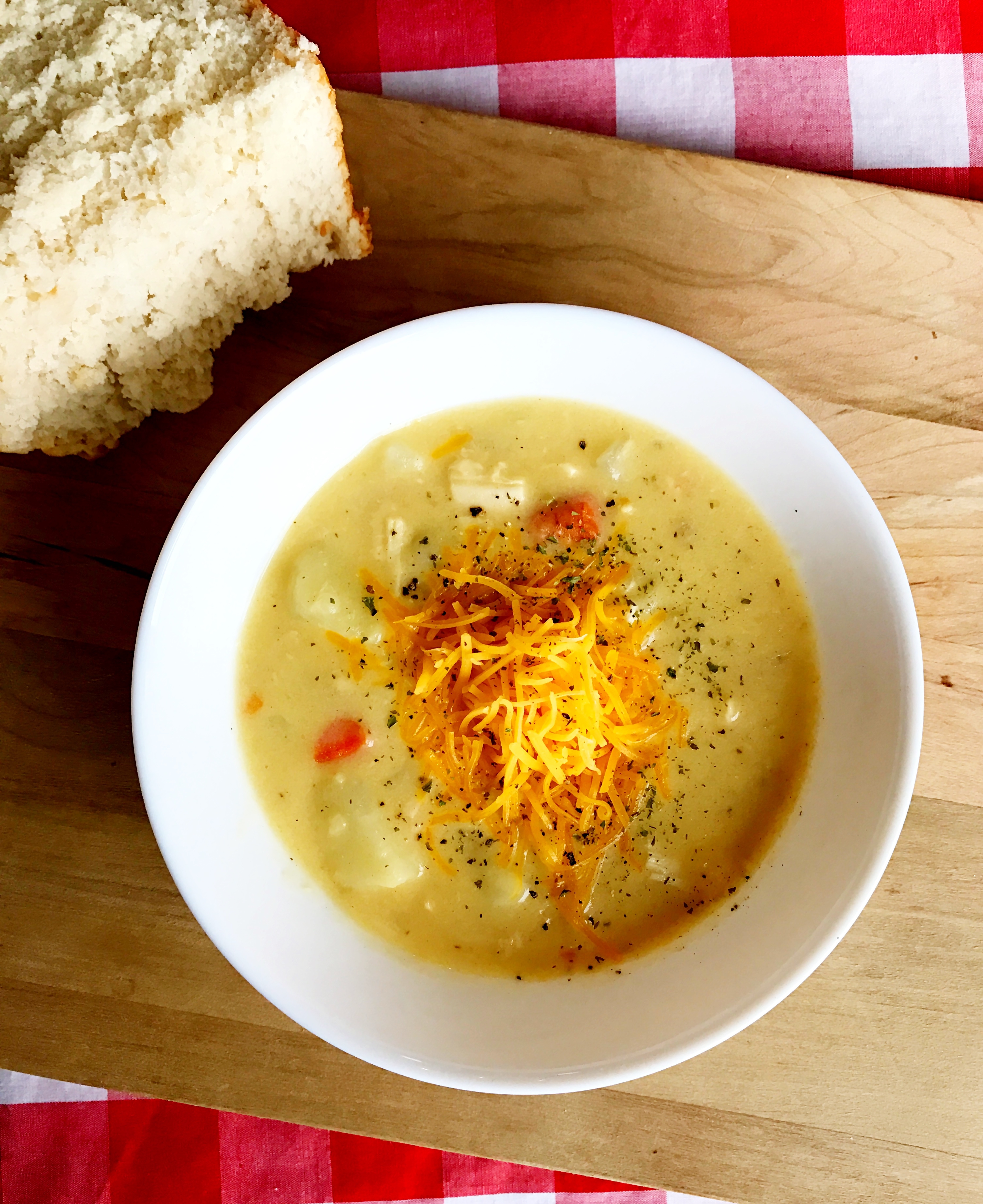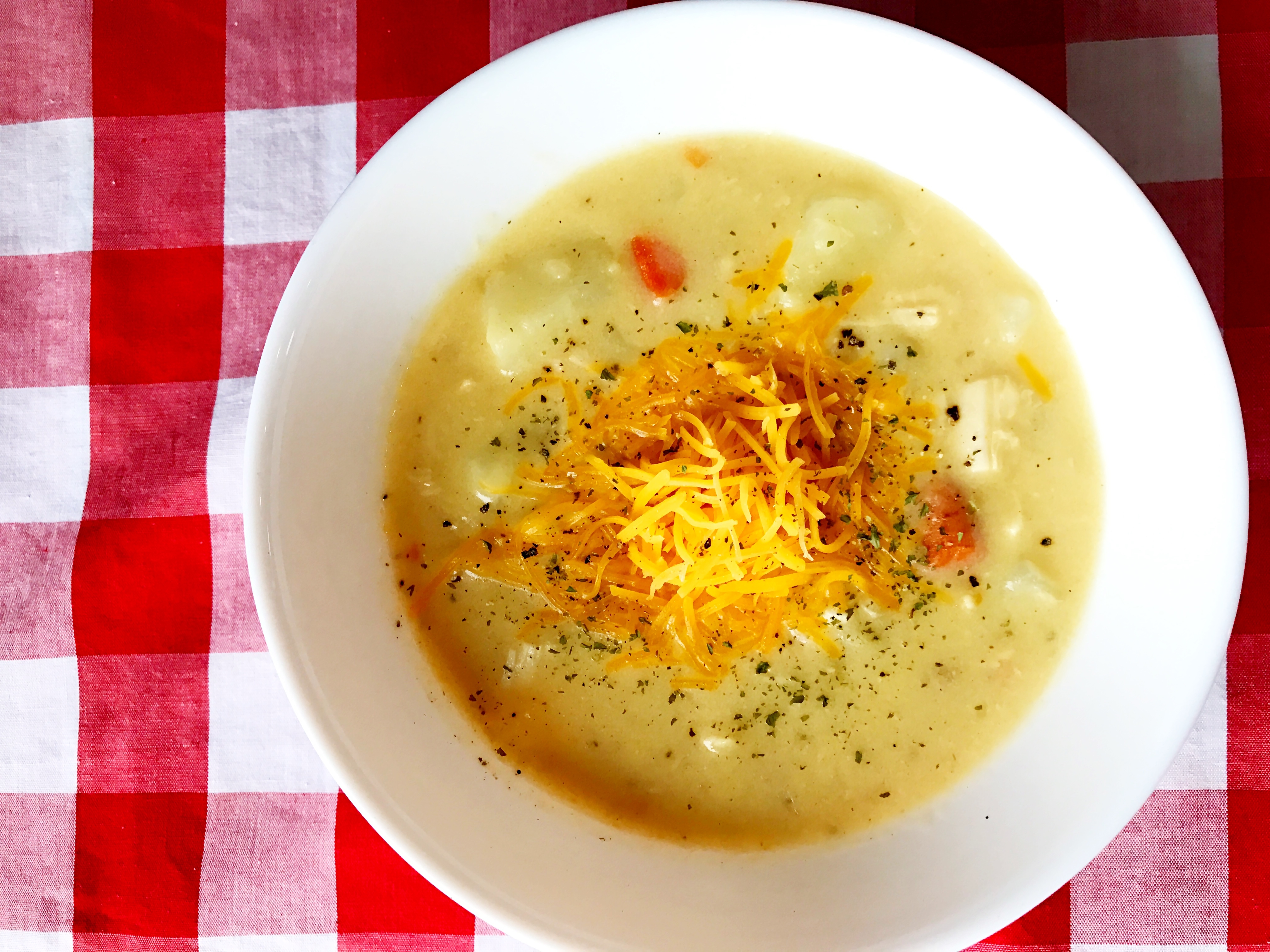 - Bring to a boil and reduce heat to a simmer. Continue simmering until potatoes are cooked. (10-12 minutes) Sir in chicken and cheese a little at a time until smooth. Season with salt and pepper to taste.