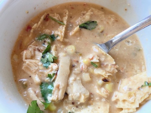 As I have mentioned before, we’ve really been on a soup kick here lately. I love that they are so simple and can last often times for more than one meal. I tried out this new recipe and my husband just loved it! It has some spice with the green chilies, taco seasoning, and cheese, and then it’s got some ‘southwest’ to it with the corn, cilantro, and chicken. I served it with more fresh cilantro, tortillas chips, and cheese on top. Why not add more cheese? 🙂 Avocado would be another delicious garnish to add.